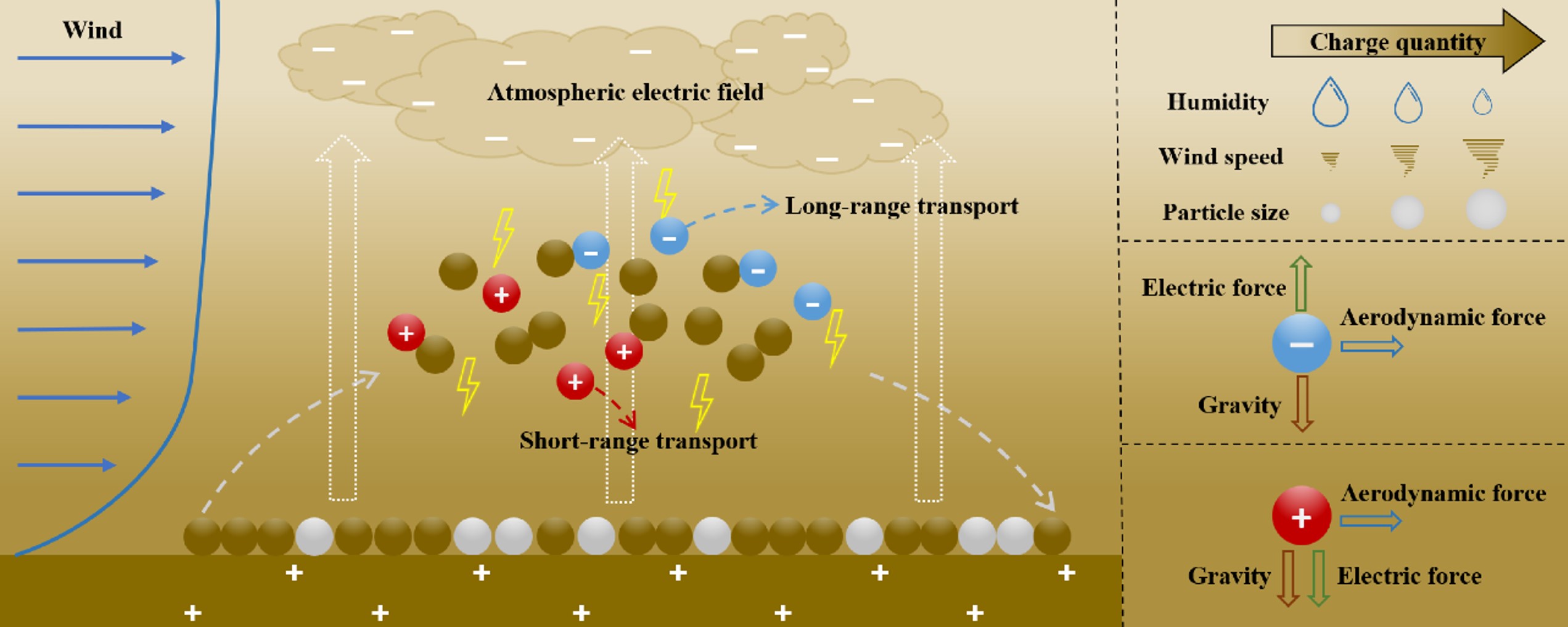 我国西北干旱半干旱农田大量使用地膜提高农作物产量,不断累积的地膜残片叠加其他塑料废弃物导致严重的农田表层土壤微塑料污染。风蚀作用下土壤微塑料释放是大气微塑料的重要来源,随风起扬的微塑料在景观或者区域尺度上导致下风向地区大气和水土资源污染。研究组评述了我国当前农田塑料污染的形势以及防治举措,利用多源遥感和人工智能技术结合地面调查确定了京津风沙源区典型区域的地膜分布状况,分析了覆膜农田表层土壤微塑料丰度影响因素的空间尺度效应,发现了土壤微塑料点源污染的“4.5千米半径现象”。研究组通过风洞试验率先证实风沙流中微塑料颗粒带电,测定了不同微塑料特征(材质和粒径)、土壤理化性质和风速等条件下风沙流中微塑料带电性质、电量及其分布概率等关键参数,分析了风速、土壤性质和微塑料特征与微塑料带电参数之间的定量关系,并基于量纲分析法构建了微塑料带电参数模型。与此同时,通过改进的密立根油滴实验方法,系统研究了电场力作用下球形、薄膜、纤维等主流形态微塑料的临界起跳电场强度,构建了临界起跳电场强度模型,推导出电场力影响下主流形态微塑料的临界起动风速模型。在上述研究的基础上,基于WRF(Weather Research and Forecasting Model)框架分析了电场力对微塑料沉降速度乃至区域运移的影响。系列研究有助于深入理解我国北方干旱半干旱区土壤微塑料污染形势以及微塑料运动机制,并提高大气微塑料区域输运路径和规模的预测精度。